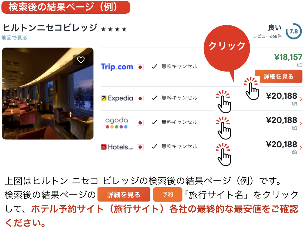 STEP2:検索後の結果ページの[各予約サイト]をクリックして最終的な最安値を確認